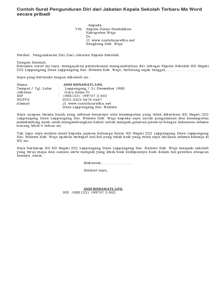 Contoh Surat Pengunduran Diri Dari Jabatan Lengkap Dengan Format Penulisan from makalah.id Untuk mempermudah dalam pembuatan surat pengunduran diri karyawan, berikut ini kami lampirkan template surat pengunduran diri dalam format microsoft word yang dapat diedit sesuai dengan kebutuhan sehingga tidak perlu membuat dari awal. Kadang walau kita sudah memantapkan pilihan untuk resign atau mengundurkan diri. Contoh dan format surat pengunduran diri resign sebelumnya saya sudah menjelaskan mengenai surat lamaran kerja yang baik dan benar nah pada kesempatan kali ini saya. Surat pengunduran diri atau surat resign bertujuan untuk memberitahu atasan bahwa kamu ingin berhenti bekerja di situ secara resmi. Dihalaman ini kamu akan menemukan pembahasan lengkap mengenai pengertian, manfaat, tujuan. Padahal, tahukah kamu surat resign yang baik bakal jadi salah satu faktor yang menunjukkan kamu karyawan. Surat ini saya buat sesuai dengan prosedur hubungan industrial dan tanpa motivasi negatif. Jika anda ingin mengundurkan diri atau resign dari kantor tempat anda bekerja sekarang, ada prosedur yang anda harus lewati.